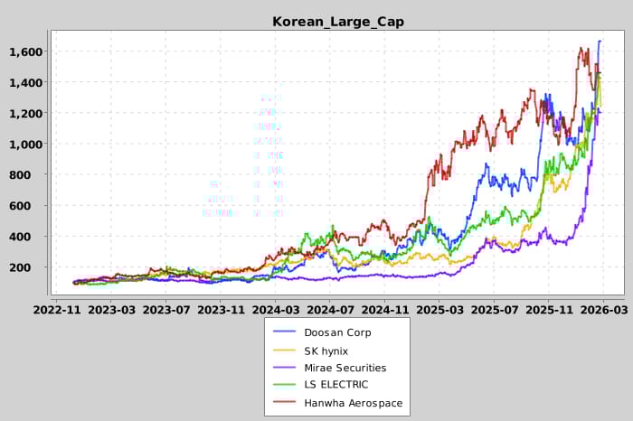 A handful of large cap stocks, Doosan Corp, Mirae Assets, Hanwha Aerospace and others, have had over 5x gains in the past year.
