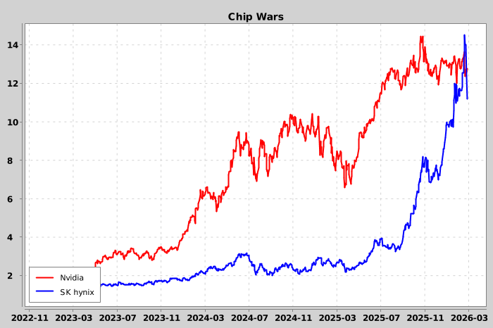 Prior to the recent correction, SK hynix had caught-up and over-taken Nvidia’s recent gains. (albeit its market cap remains less than ten percent)