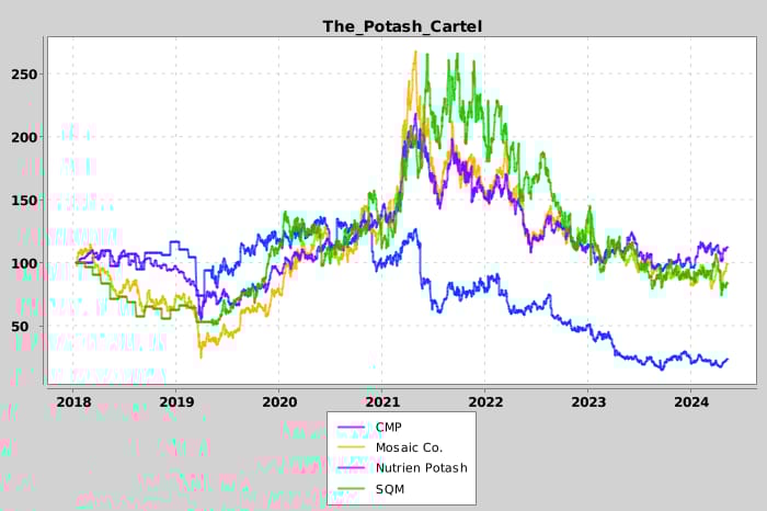 There are only handful of major producers of globally: Nutrien Ltd (NTR), The Mosaic Company (MOS), Sociedad Quimica y Minera (SQM), Compass Minerals (CMP), and German K+S Potash.